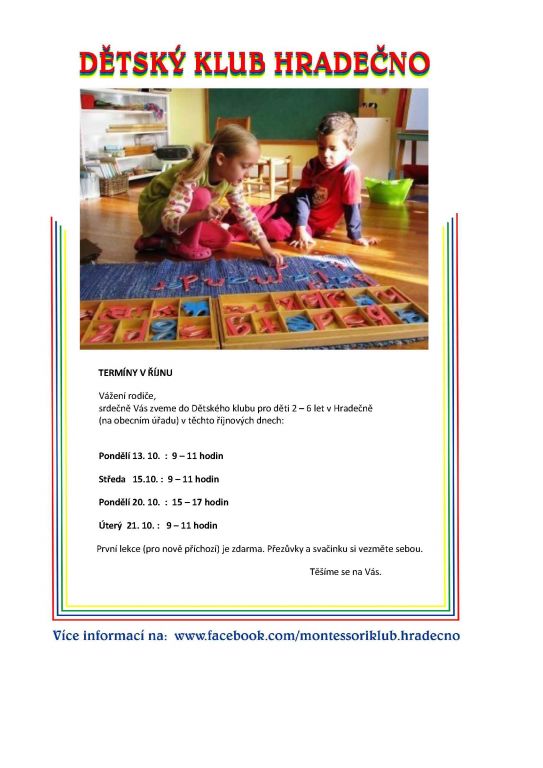 Ve čtvrtek 8. října 2014 zahájil svou činnost klub pro děti od 2 do 6 let na Obecním úřadu v Hradečně.