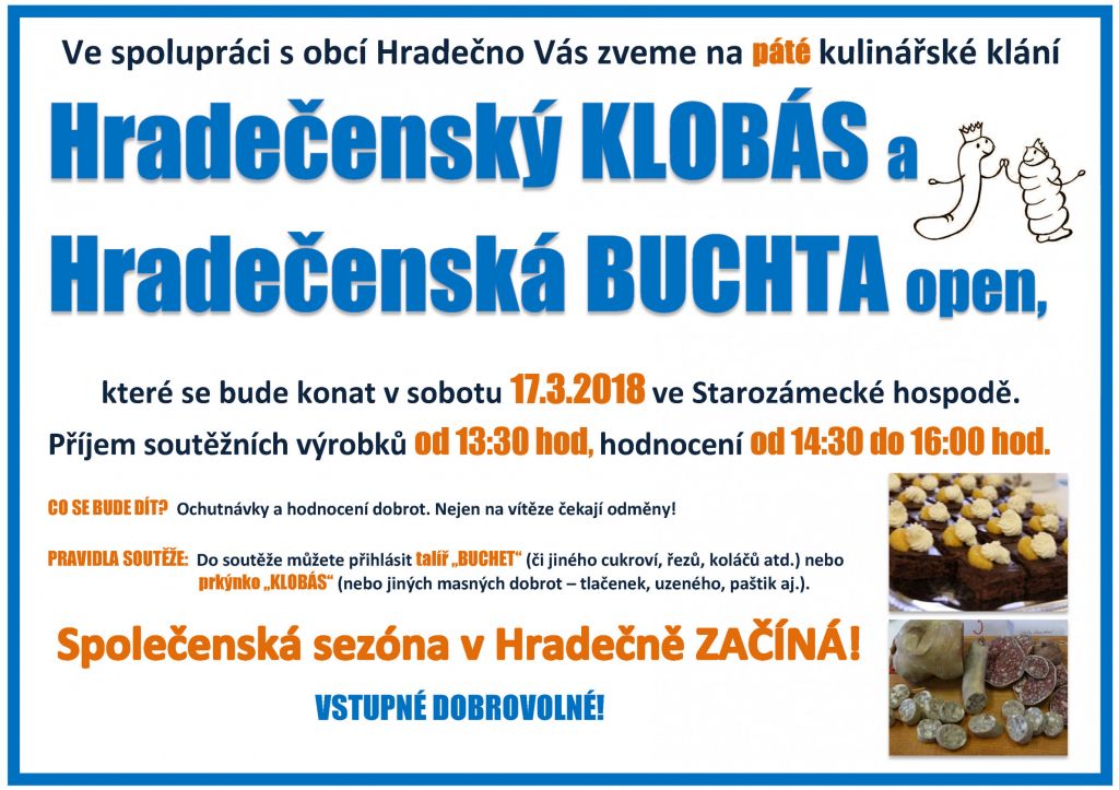V sobotu 17.3.2018 se v hospodě bude konat další ročník kulinářské soutěže Hradečenská buchta a hradečenský klobás open 2018. Těšíme se na vaše příspěvky i hodnocení exponátů.