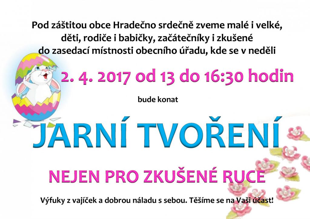 Také se už těšíte na jaro? Jarní tvoření pro malé i velké se bude konat v zasedací místnosti na obecním úřadu v neděli 2.4.2017 od 13 hodin.