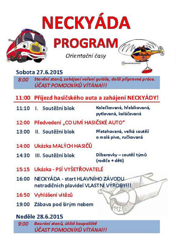Letošní NECKYÁDA proběhne opět poslední červnovou sobotu u místního "koupaliště". Tentokrát v duchu záchranných složek. Připravujte plavidla. Bude oceněna hlavně originalita!